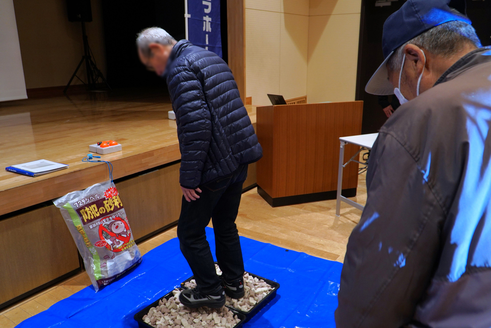 参加いただいた皆さま、感嘆の声を上げたり、説明にうなずいたりととても興味を持って聞いていただけたようです。セミナーの最後には用意した商品を触ってみる体験会も実施。防犯砂利をガチャガチャ踏んでみたり、防犯ブザーの音の大きさに驚いたり、防犯シャッターに興味津々の様子でした。