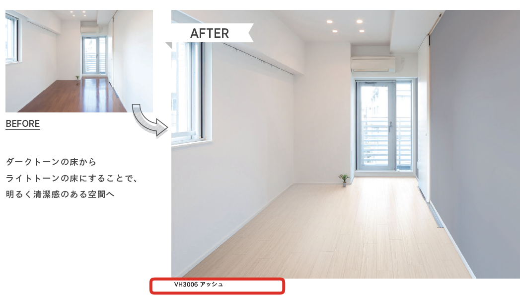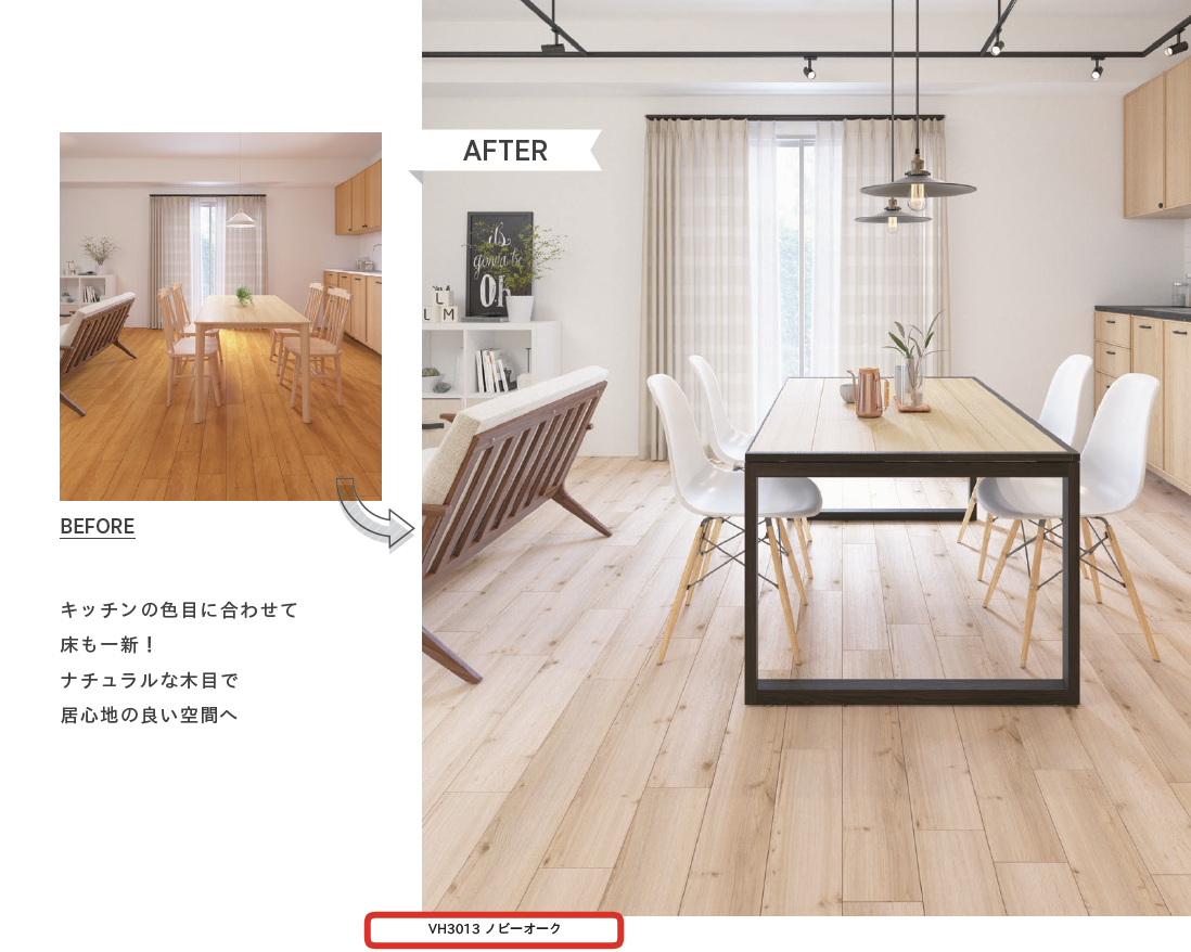 大掛かりと思われがちな床の貼り替えも フロアタイル リクシル 《ホームベスタ》なら既存の床に上貼りするだけでリフォームが完成するのでぜひおすすめです。
