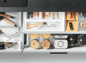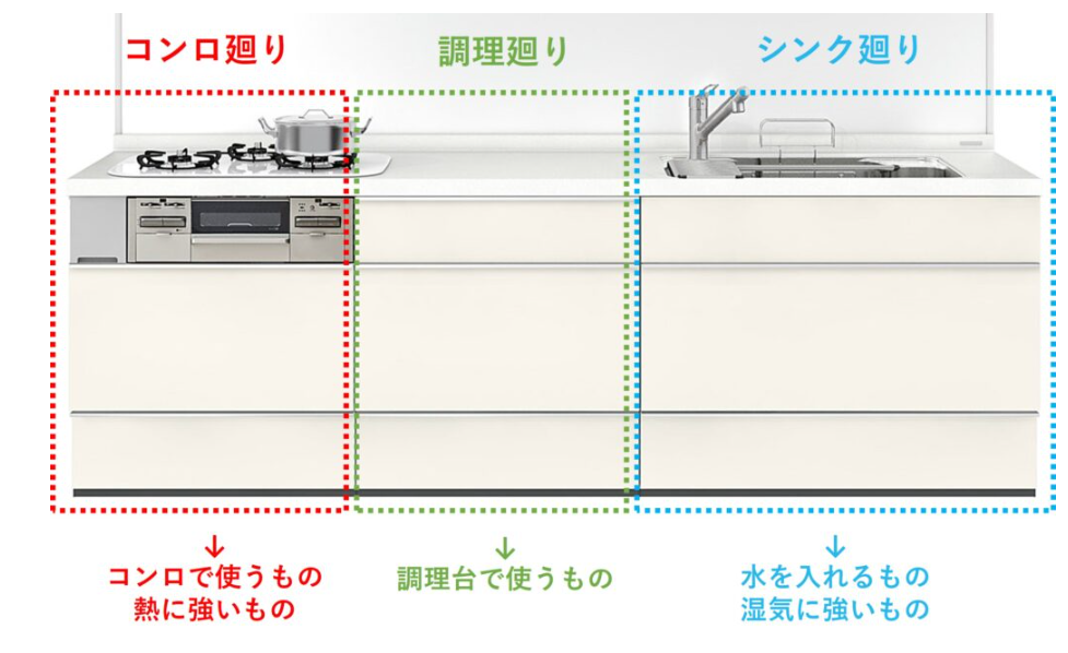 キッチンは収納の充実が大切です。なるべく見えない収納をこころがけ、使い終わった調理器具や食器はきれいに洗って収めましょう。