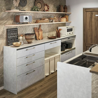 そこで、背面収納のカウンター下をオープンスペースとして、シンプルなふた付ゴミ箱を置くと、おしゃれなイメージを損なわずに見栄えもよくなります。