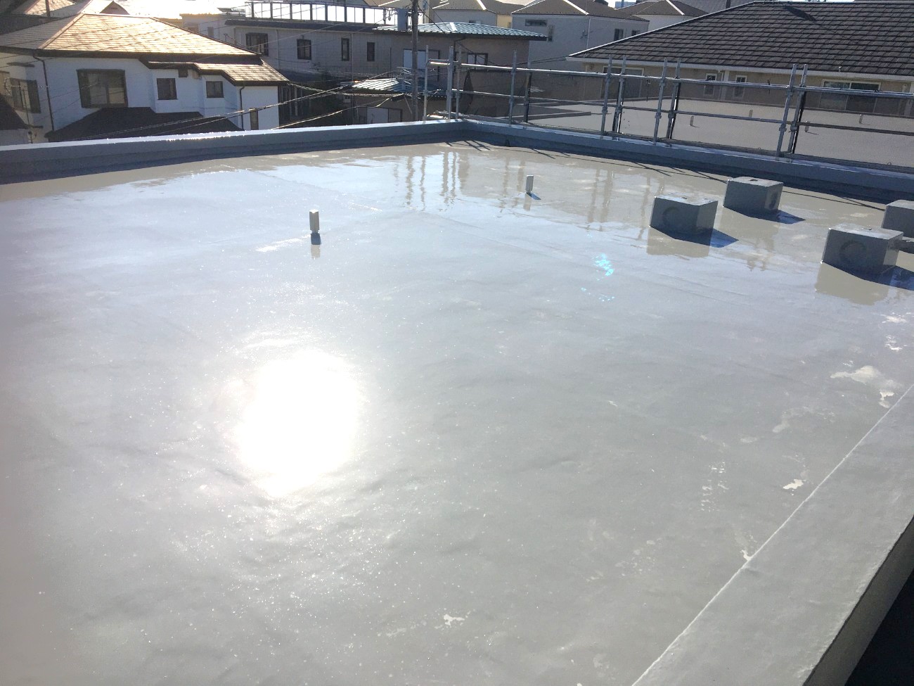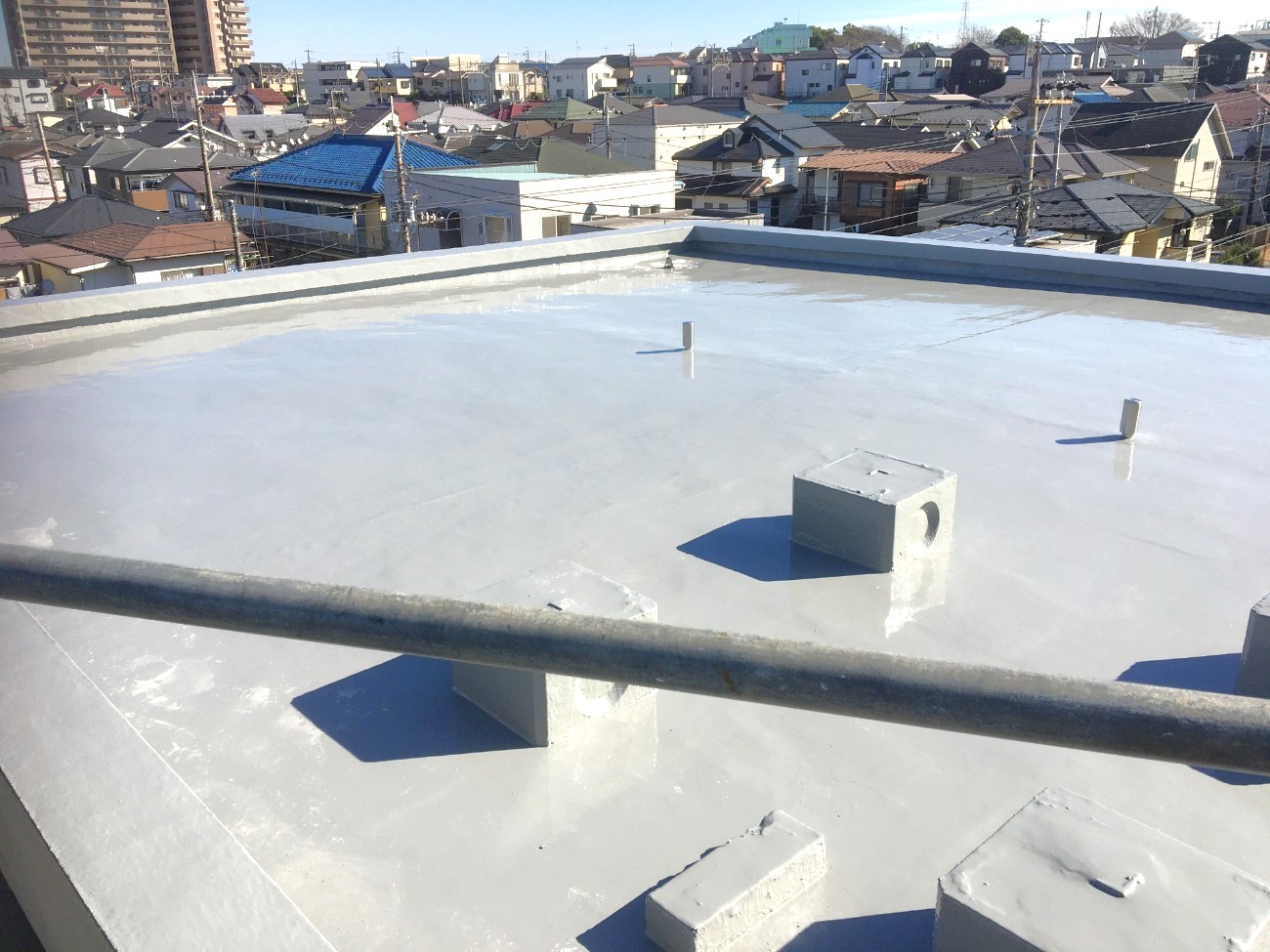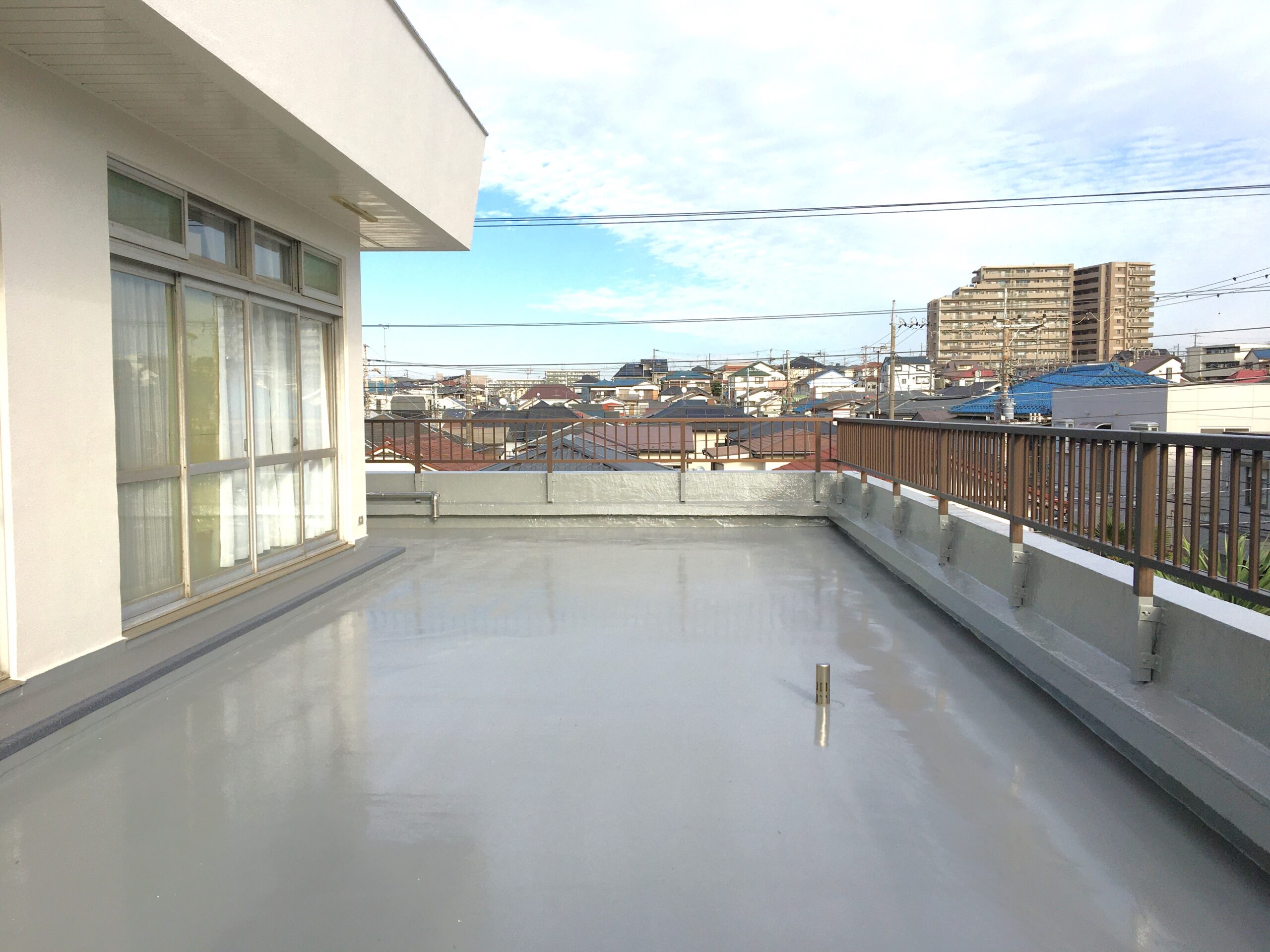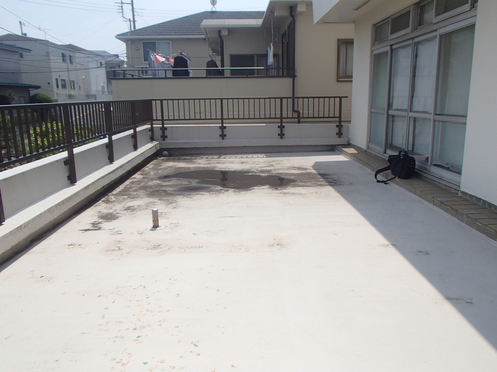 築年数経過に伴う屋根防水材の劣化、外部鋼製階段の腐蝕、雨漏り発生がございました。