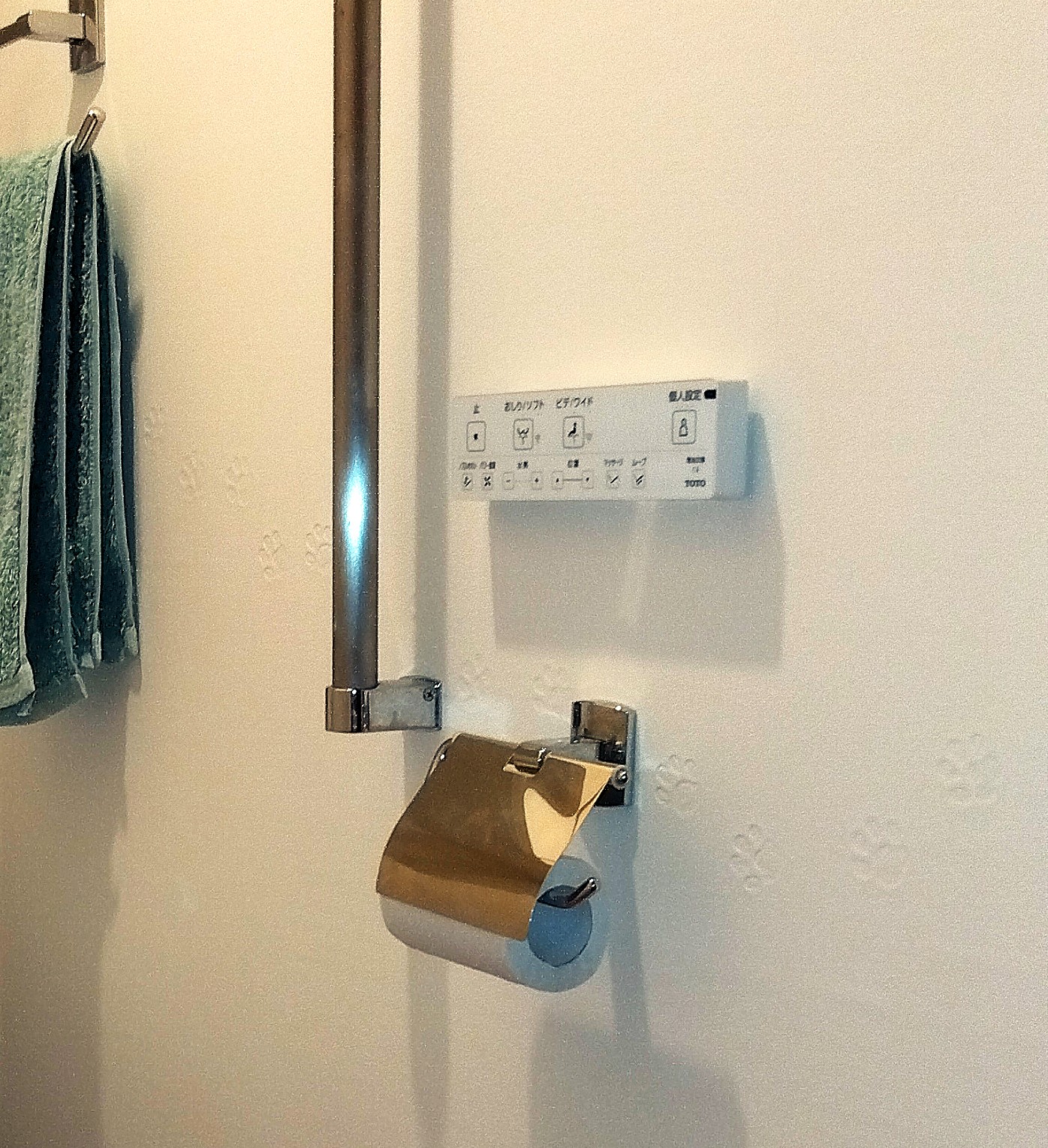 ・壁と天井のクロスは、奥様のお好みで猫の足跡の柄が付いたかわいらしいクロスをご選択。壁から天井へ足跡が続くようにクロスを貼るというこだわりで、とてもかわいらしく思わず目で追いたくなります。ふふっと笑みがこぼれる癒しのトイレ空間が完成しました。